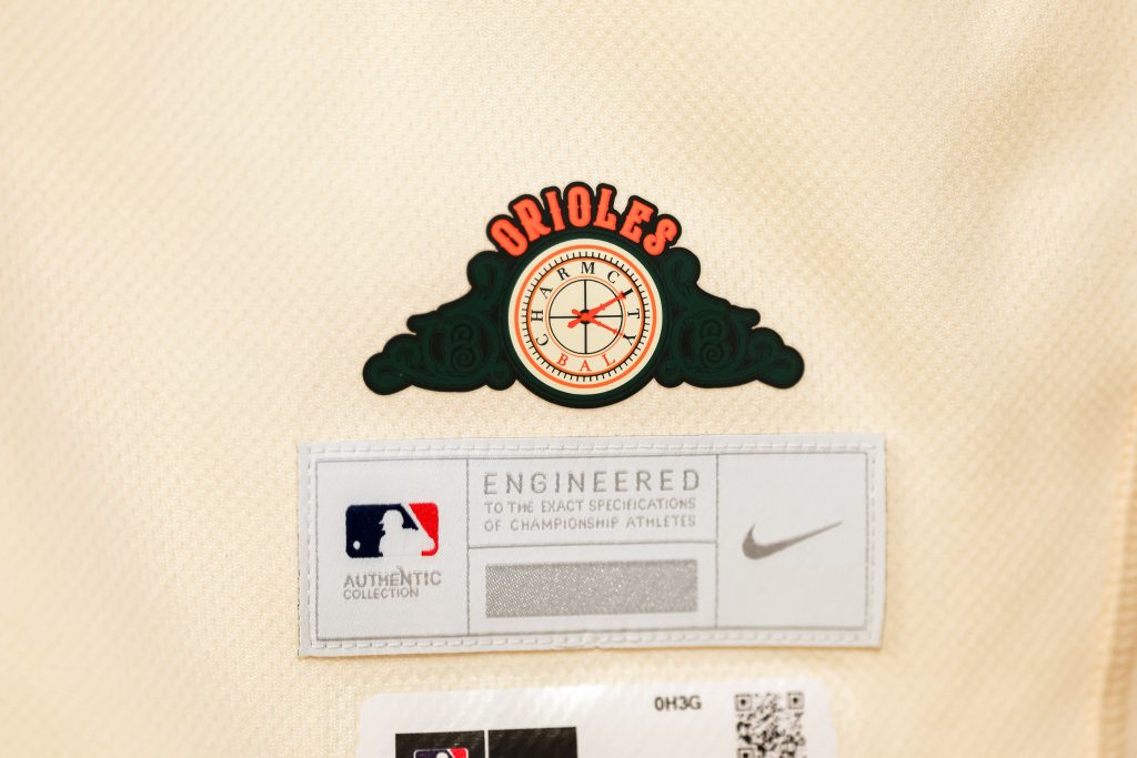 Big stoop energy is the driving force behind the uniform, with BMORE across the chest to represent every neighborhood of Charm City with a shorthanded name for Baltimore and an ornithologically correct Oriole bird perched on the “R,” and the white panel cap with an orange B that’s inspired by the Baltimore Baseball Club of the 1890s.
